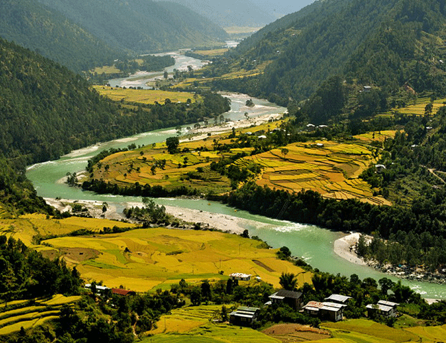 確實(shí)如此。車子拐過(guò)一個(gè)彎。我看見(jiàn)暖色的陽(yáng)光打在龐大的白色建筑上,反射出溫暖又華麗的色調(diào),冷沁的冰川融水從這里緩緩而過(guò),釋放著生命流動(dòng)的氣息,普納卡宗就這樣安祥地依偎在蔥綠的森林之中,在珍稀高山植物的掩映下,越發(fā)顯得古典優(yōu)雅。