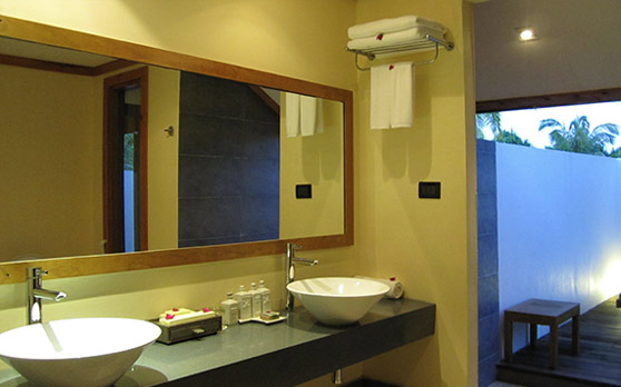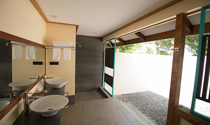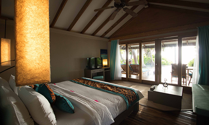 木質(zhì)陽臺(tái)風(fēng)格的住處,頗具當(dāng)?shù)匚幕厣?臻g開闊的瀉湖按摩沙灘別墅 (Lagoon Jacuzzi Beach Villas)提供了所有沙灘別墅的設(shè)施。其中包括大于58平方米的房間,熱帶風(fēng)格的四柱床,私人按摩浴缸,花園庭院。別墅造型設(shè)計(jì)極富當(dāng)?shù)匚幕厣F(xiàn)代化設(shè)施一應(yīng)俱全,長廊內(nèi)樹木茂盛。在此,旅客可飽覽長約4公里的海灘及島上藍(lán)色珊瑚礁的壯麗景致。