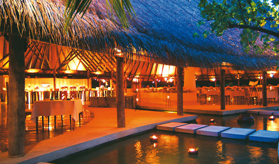 餐廳設置在庭院中,是一個巨大的大餐廳,周圍圍繞著水池,燈光昏黃優(yōu)美。供應馬爾代夫、泰國及其他亞洲地區(qū)的美味佳肴。
