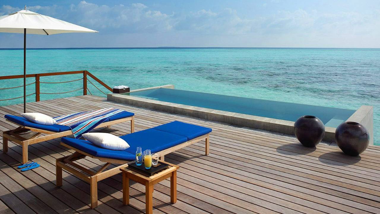 日出/日落雙臥室水上套房位于水上別墅碼頭的另一端,可一覽礁湖風光及日出或日落美景。在帶有泳池的延伸平臺上沐浴陽光,這里設有海...查看更多