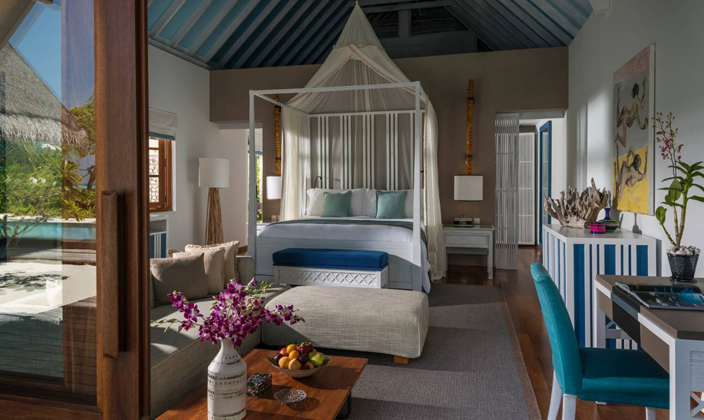 雙臥室海陸雙景套房不僅配備超大私人泳池、水上吊床、海景用餐平臺,并設有通往瀉湖的階梯,而且靠近色彩絢麗的Yin and Yang珊瑚花園,您可以盡情享受精彩紛呈的戶外活動。雙臥室海陸雙景套房別具風情,它懸浮于寧靜優雅的海面之上,您可在兩個亭閣式臥室之中隨心選擇,度過美妙迷人的海上一夜。