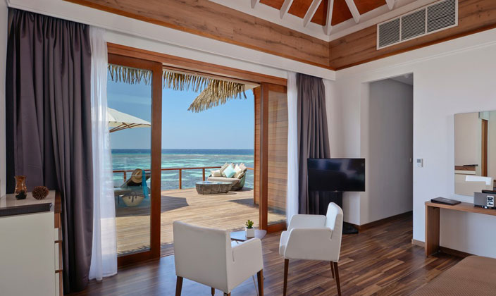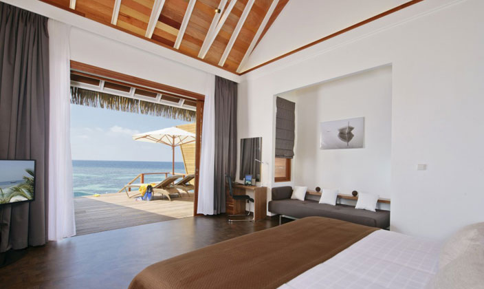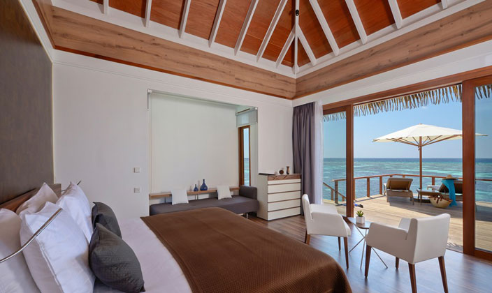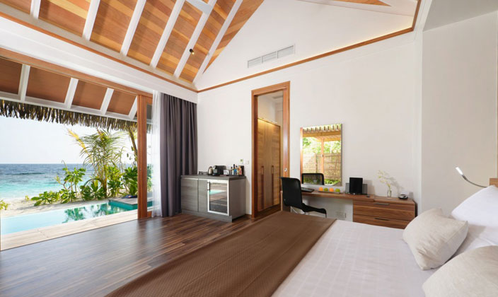 面對(duì)夕陽,海洋池在Kandolhu別墅提供最好的體驗(yàn)。每個(gè)人都有自己的私有走道到達(dá)和包括一個(gè)特大床,沙發(fā)床和衣櫥。浴室是開放的,通風(fēng),淋浴間,雙洗手盆和浴缸,私人甲板上設(shè)有躺椅,太陽傘和一個(gè)跳水池(7平方米),可以欣賞到印度洋的無限美景。