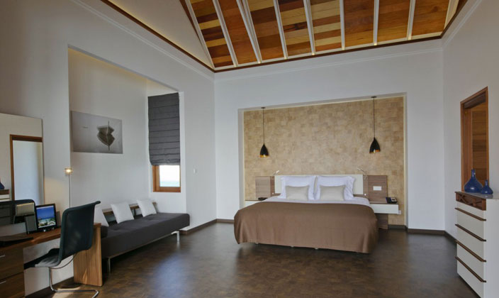 坐落在島的西側(cè),為兩層樓的別墅,地面層也有一個(gè)大衣柜和帶淋浴間,雙洗手盆,獨(dú)立的浴缸和獨(dú)立淋浴戶外花園浴室。在前面的陽臺(tái)設(shè)有一個(gè)室外沙發(fā)床和用餐區(qū)。一個(gè)單獨(dú)的露臺(tái)設(shè)有游泳池(18平方米),日光躺椅和太陽傘。上層設(shè)有一間寬敞而通風(fēng)的臥室配有特大床,第二間浴室。