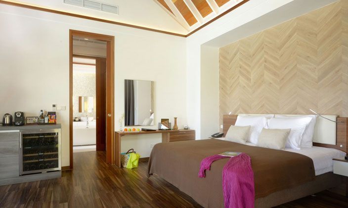 位于水面上,這些別墅設(shè)有寬敞的臥室配有特大床,沙發(fā)床,可欣賞到大海。浴室面臨的瀉湖設(shè)有按摩浴缸,雙洗手盆,淋浴和更衣區(qū)。陽光甲板的私人與躺椅,太陽傘,可直接下到海中。
