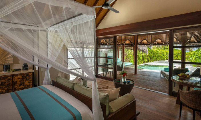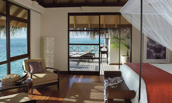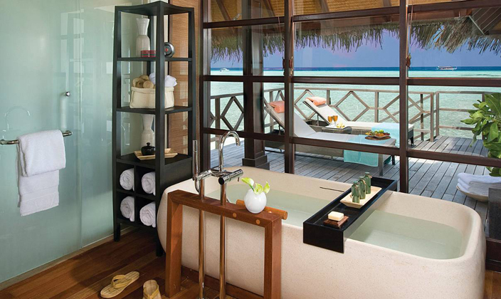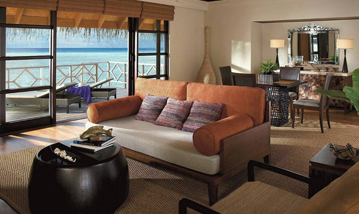 日出/日落單臥室水上套房采用傳統(tǒng)粉刷墻面和馬爾代夫茅草屋頂,室內則采用天然織物、藤制、柳編和深色橡木家具精心裝點,給您自然原生態(tài)的愜意氛圍。設有兩種露臺供您選擇,一種設有日光躺椅和通向礁湖的階梯,另一種設有私人露臺和室外泳池淋浴間。