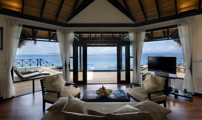 在水上別墅的無邊泳池中戲水,領略印度洋的震撼景致。玻璃地板迤邐的海洋生態一覽無遺,推開房門便可踏進瀉湖,感受湖底的柔沙,讓湖水撫慰身心。