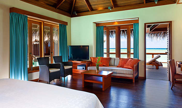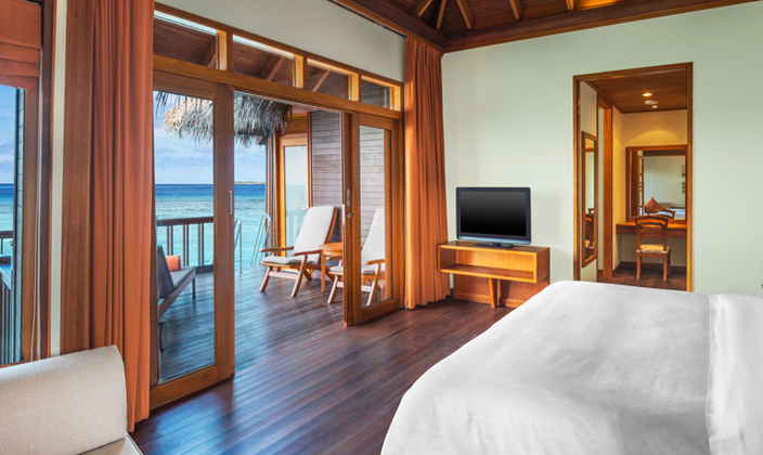 入住舒適的行政水上別墅,體驗美好難忘的浪漫時光。悠閑地躺在露臺躺椅上,欣賞水晶般清澈的海水,或退居室內,享受現代化的科技和...查看更多