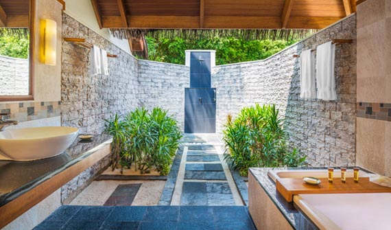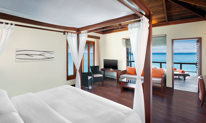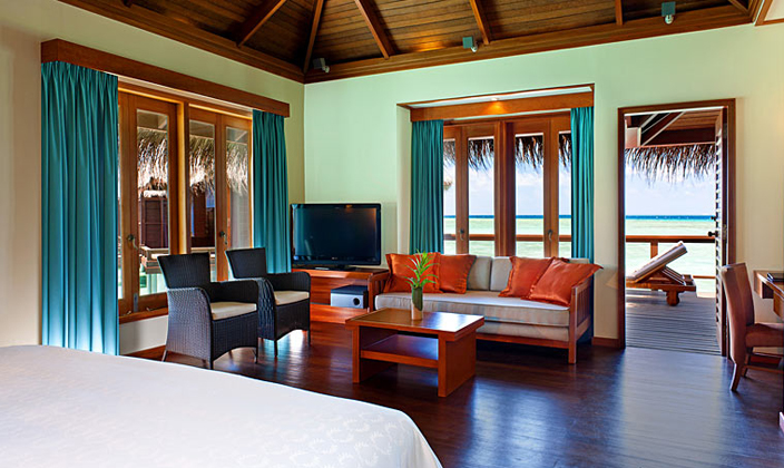 獨有的水上套房設有帶私人露臺的獨立休閑區以及時尚家具,其中包括舒適的藤制座椅和玻璃面桌子。 舒適宜人的臥室可俯瞰第二露臺區,并設有日光躺椅,可直通大海。 寬敞的浴室可直通兩座露臺,并設有一個舒適宜人的露天按摩池,是您放松休閑、飽覽變幻無窮的印度洋美景的絕佳之地。