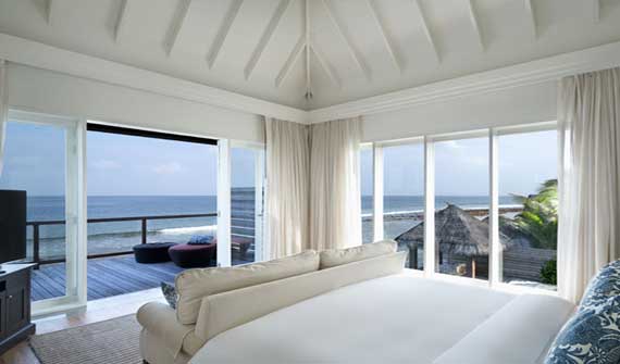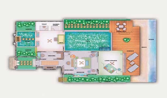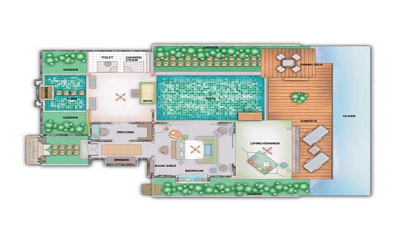 桃花源地,海濱靜居,盡享無與倫比的私密。300平方米寬敞迷人的空間,更有客房管家每天24小時貼身服務,悉心照顧您的每一需求。寬敞的硬木甲板直通印度洋海面,在日光躺椅上曬曬太陽,靜看海浪層層疊起。不遠處就是潔白細膩的沙灘和綠松石般的瀉湖,唯您獨享的海濱涼亭更令誘惑難以抵擋。在優美的別墅內盡情放松,雅致的硬木裝飾與經典設計和自然色調融為一體。在您的個人蒸汽房內酣暢淋漓,再去享受瀑布淋浴的清涼愜意。私密的35平方米泳池,使用海洋風情的淺綠色瓷磚鋪就,暢游之后再浸入獨立的下沉式浴缸泡個熱水澡。探索各種現代化舒適便利與招牌奢華享受。