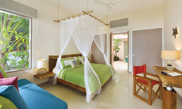 別墅里環(huán)繞著青翠的熱帶景致,房間格局錯(cuò)落有致,裝飾清新簡約,色調(diào)豐富多彩。首先看到的是附有沙發(fā)的落地窗,里面則是一個(gè)帶有吊簾的特大床。雖然沙灘別墅是入門級別的房型,但是設(shè)計(jì)師巧妙的精心安排,一定能讓您得到最舒適的享受。