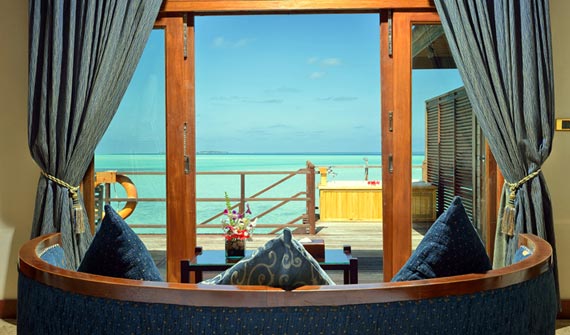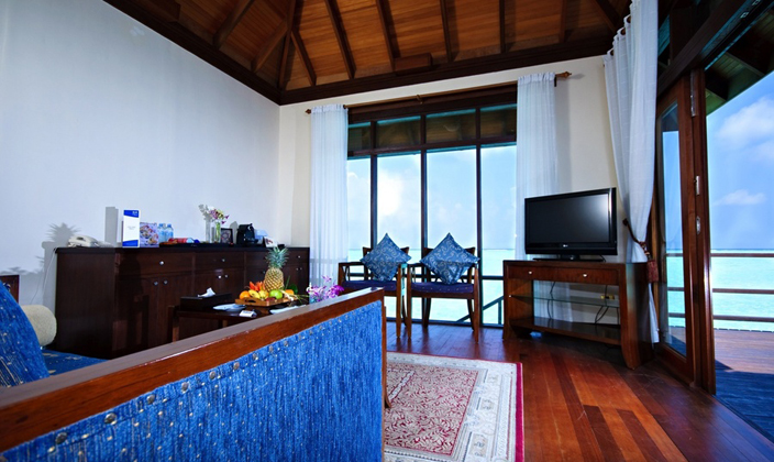 總統水上別墅可提供無障礙的遼闊視野和完全的私密空間。套房融合了現代設計和傳統馬爾代夫式建筑風格。房中有兩間臥室,屋外是雙層式柚木陽臺,第一層陽臺設有私人泳池和露天按摩浴池,第二層陽臺上有可供直接下海浮潛的樓梯。