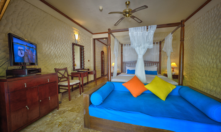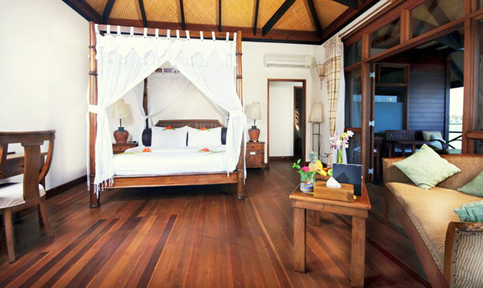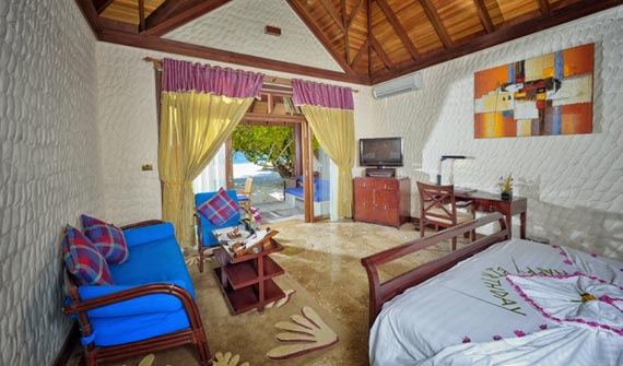 一棟客房有上下兩層共4個套房,都是面海而建,有露天陽臺。陽臺離海很近,站在陽臺上就可以俯視珊瑚海灘和瀉湖的美景。房中有起居室和寬敞的衛浴室,還包括舒適大床、沙發和衛星電視等。