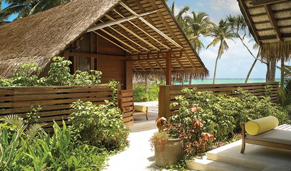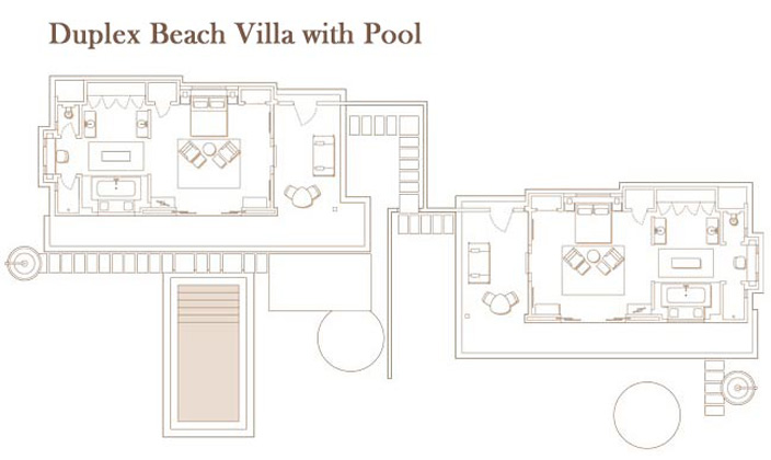 兩幢獨立別墅坐落在私密的原始海濱區域,環境雅致,是極致奢華的生活空間。一幢別墅除了擁有裝飾精美的起居區和用餐區外,還采用了雙臥設計,主臥設有一張特大床,次臥設有兩張大床,并且每間臥室內均設有豪華浴室,配有大浴缸和淋浴。另一幢別墅同樣豪華,設有寬敞的浴室、室內和室外淋浴以及私人陽臺。兩幢別墅共用一個面積 50 平方米/538 平方英尺的私人泳池、別致的戶外起居區和用餐區,以及一個直接進入瀉湖的私人入口。客人可請私人廚師在戶外用餐區烹飪美食。