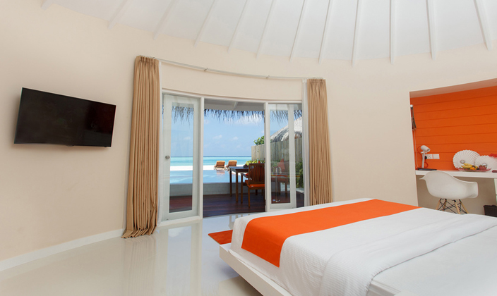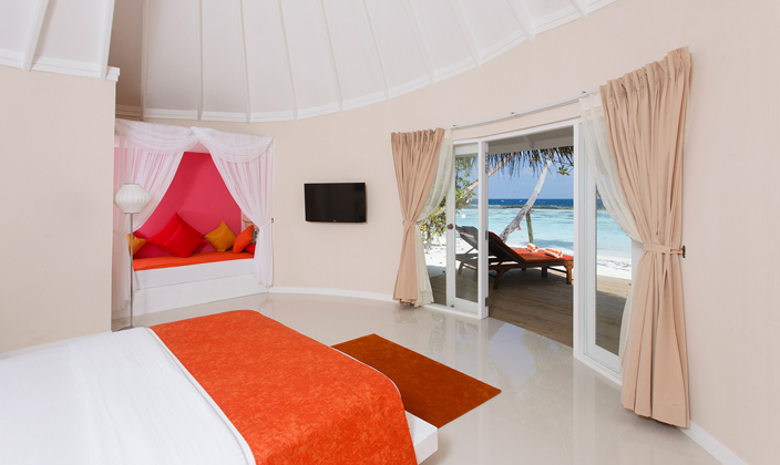 這個(gè)是一個(gè)新房型,從2015年2月開(kāi)始出售,房間比之前的沙屋更大,全白色的室內(nèi)裝飾上了柔軟的熱帶色彩主題。橙色和粉紅色為房間的主要風(fēng)格,增加了一點(diǎn)神秘和浪漫。全玻璃的推門(mén),有私人陽(yáng)臺(tái)俯瞰海灘,出門(mén)就是瀉湖沙灘。