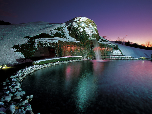入口處的“阿爾卑斯”噴泉巨人雙眼發出閃爍光芒、瀑布自口中瀉下的情景,是整個展館最具懾人魅力的部分之一。進入大堂有一塊高11米、寬42米、現存世界上最大的水晶墻,一共用了12噸的水晶石做成,讓人驚嘆。