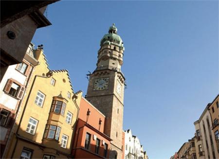 建于1358年的市政廳內(nèi),有一座修筑于1442~1450年的城市塔樓,是茵斯布魯克老城區(qū)的象征。塔高57米,原來是座了望塔,塔樓上還曾設(shè)有牢房。后來于1560年重建,用小圓頂代替了尖頂,撤消了監(jiān)獄和了望的功用。現(xiàn)在成為著名的觀光游覽景點(diǎn),在塔樓的33米處有一座回廊,游客們可以從這里飽覽茵斯布魯克市的全景及四周環(huán)繞的山峰。