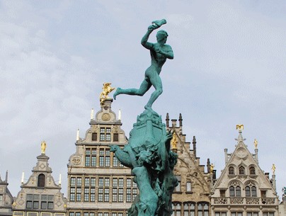 安特衛普市政廳前的布拉伯噴泉(Brabo)中間的雕像,表現的是安特衛普名字的由來——“安特衛普”來源于荷語“handwerpen”,即扔掉手掌的意思,這也就是著名的安特衛普紀念碑。