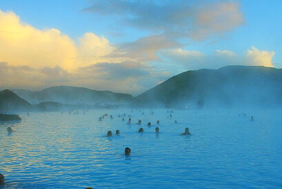 冰島著名的戶外浴池,是世界著名的地?zé)釡厝挥诶卓搜盼纯耸袞|南方向。人們稱藍(lán)湖是個(gè)“天然美容院”。藍(lán)湖的形成十分特別,海水經(jīng)過(guò)地下高熱火山熔巖層而吸收熱量,水中含有許多化學(xué)與礦物結(jié)晶,這些結(jié)晶已被