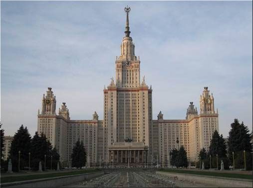 莫斯科市中心。1953年大學新主樓在麻雀山建成后,莫大即遷至麻雀山。這座主樓是莫斯科七座斯大林式建筑(號稱七姐妹)之一,斯大林式建筑是典型的中央集權式建筑,大底座、高尖頂,流露出強烈的“一元論”價值觀。主樓高240米,共39層,有三萬多房間,它集各種功能于一體,食堂、住宿、辦公、娛樂、禮堂、超市、郵局、銀行、書店、圖書室等等。