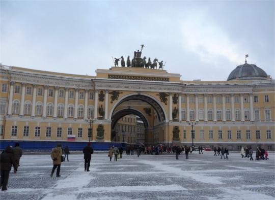 國家博物館。冬宮的四面各具特色,但內(nèi)部設(shè)計和裝飾風(fēng)格則嚴(yán)格統(tǒng)一。冬宮面向?qū)m殿廣場,中央稍微突出,有三道拱形鐵門,入口處有阿特拉斯神巨像。