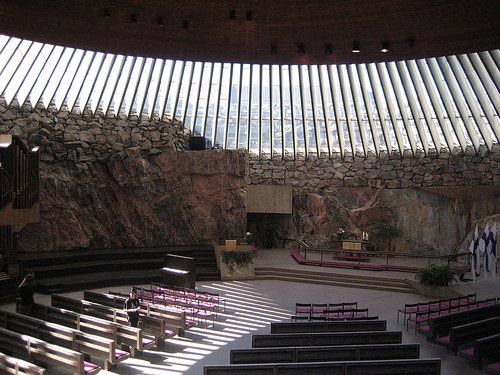 建造在掏空的巖石中的巖石教堂,教堂為圓頂,教堂頂部的玻璃屋頂以銅網(wǎng)架支撐,直徑24米,外部墻壁以銅片鑲飾,內(nèi)壁則完全保持了天然的花崗巖石壁紋理,其余的壁面仍保有原始的巖石風(fēng)味,教堂入口走廊為隧道狀,入口處則涂以混凝土,整座教堂如同著陸的飛碟一般,趣味獨具。