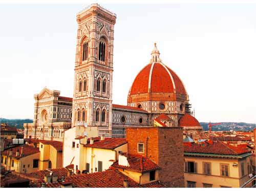 本圖欣賞的這座佛羅倫薩主教堂,就有紀念性意義的原因:1293年,市內行會紛紛起義,貴族權利完全受到排斥。為了紀念這場平民斗爭的勝利,佛羅倫薩市政當局決定興建一座大教堂,以表彰市民的力量與財富。設計任務委托給一位著名的建筑師坎皮奧(Arnolfodi Cambio,?~1302),并在給他的信中寫道:您將建立人類技藝所能想象的最宏偉、最壯麗的大廈。在這座佛羅倫薩主教堂的附屬建筑中,最被歷史稱頌的是在主教堂西南面的那座鐘樓,我們能在圖片上看到它的巍峨雄姿。 這座鐘樓約有13.7米見方、84米高。從1384年起,三年后建成。