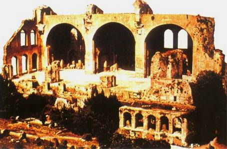 巴西利卡意思是長方形會堂。該建筑始建于公元306年—310年,由君土坦丁大帝于公元312年—337年完成,是古羅馬筒狀穹窿建筑的代表作,今尚存北邊三個巨大的穹窿。整個建筑平面呈矩形,穹窿及其支撐結(jié)構(gòu)顯得莊重,具有紀念性,因此,這種巴西利卡也就成為后來基督教建筑的一種模式。