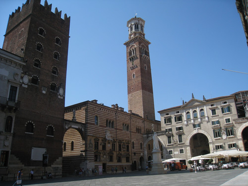 廣場右側附屬于市政廳的蘭貝爾提塔(Torre di Lamberti)是維羅納的標志性建筑之一,登上塔頂參觀,可以將整個廣場和市區景色盡收眼底,還可以遠眺阿迪杰河兩岸的美妙風光。
