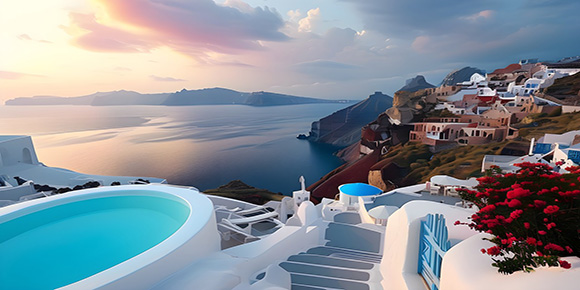 18:00 {伊亞小鎮(zhèn)觀看“最美落日”}(含小鎮(zhèn)約1.5h),被世界旅游組織評為10佳觀賞落日的地點之一,落日下的伊亞小鎮(zhèn)不再單單是藍白的組合,金色是它的第三種顏色。漫步鵝卵石鋪就的彎曲的小路,被愛情的腳步磨的泛著白光,街道兩旁布滿了潔白如雪的房屋,蔚藍色的迷你游泳池和懸崖底下寶石藍色的愛琴海遙相呼應(yīng),美麗而浪漫。