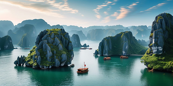 ※【下龍灣】下龍灣是越南北方廣寧省的一個海灣,風光秀麗迷人,聞名遐邇。風景區共分為東、西、南3個小灣。因其景色酷似中國的桂林山水,因此被稱為“海上桂林”1994年,聯合國教科文組織將下龍灣作為自然遺產,列入《世界遺產名錄》。下龍灣各小島嶼典型的形式為伸出海面的鋸齒狀石灰巖柱,還有一些洞穴和洞窟,共同形成一幅異國風味的如畫景致。水域和熱帶森林中可見各種不同的海生及陸生哺乳動物、鱷、魚類和鳥類。