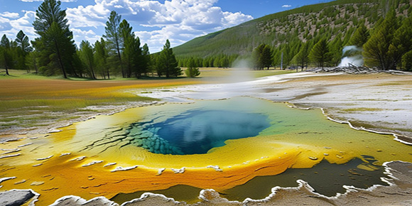 綠波盈盈處是黃石的湖水, 與背景中藍天白云相互輝映,形成與黃石其他溫泉區不同的景觀。