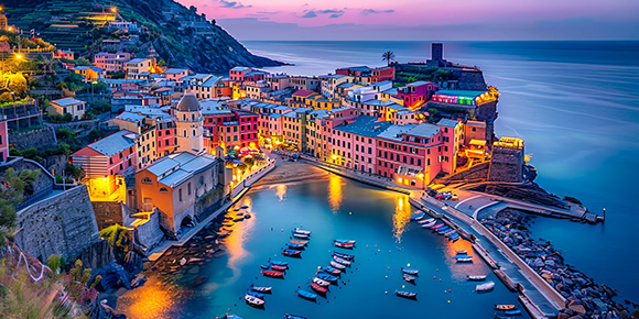 13:00 游覽五漁村(游覽約30 分鐘),碧澈的海水和奇巧的險(xiǎn)峰讓這五個(gè)靜靜躺在利古里亞海邊山坳中的小漁村有了如詩(shī)如畫的醉人之美。沉浸于古老的遺跡與壯觀的景致在碧綠大海的襯托下,沿線右邊是壯麗陡峭的山崖,左邊即是蔚藍(lán)深邃的利古里亞海,遠(yuǎn)看彷佛十分驚險(xiǎn),就像走在石壁之中,讓走在小徑上的戀人緊緊地牽起雙手,佳人美景更添濃情蜜意。
