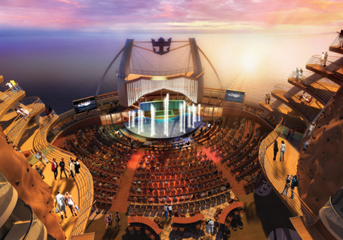 海洋綠洲號(hào)郵輪上擁有一片開闊的露天廣場(chǎng),兩邊則為帶有陽(yáng)臺(tái)的客房。廣場(chǎng)上既可見到郁郁蔥蔥的熱帶景觀,又有安靜的走道,露天餐廳,服裝店和畫廊,此外還有音樂會(huì)和街頭藝術(shù)表演。格外與眾不同之處在3層甲板間緩慢上下移動(dòng)的酒吧,名為Rising Tide Bar(涌潮酒吧)。