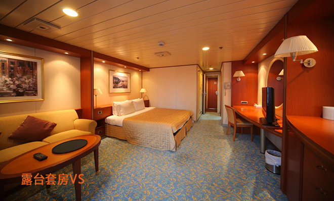 海景房:兩張雙人床(可改成大床)、起居間(有些帶沙發(fā)床)、私人浴室和洗臉盆。(20平方米)