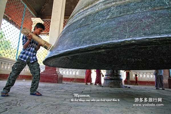 不遠處還有一座世界上最大的尚在使用的鐘——敏貢大鐘。高8米,直徑5米,重90.55噸。交給看管大鐘的人一點善款,也可以親自用木棒敲響大鐘。