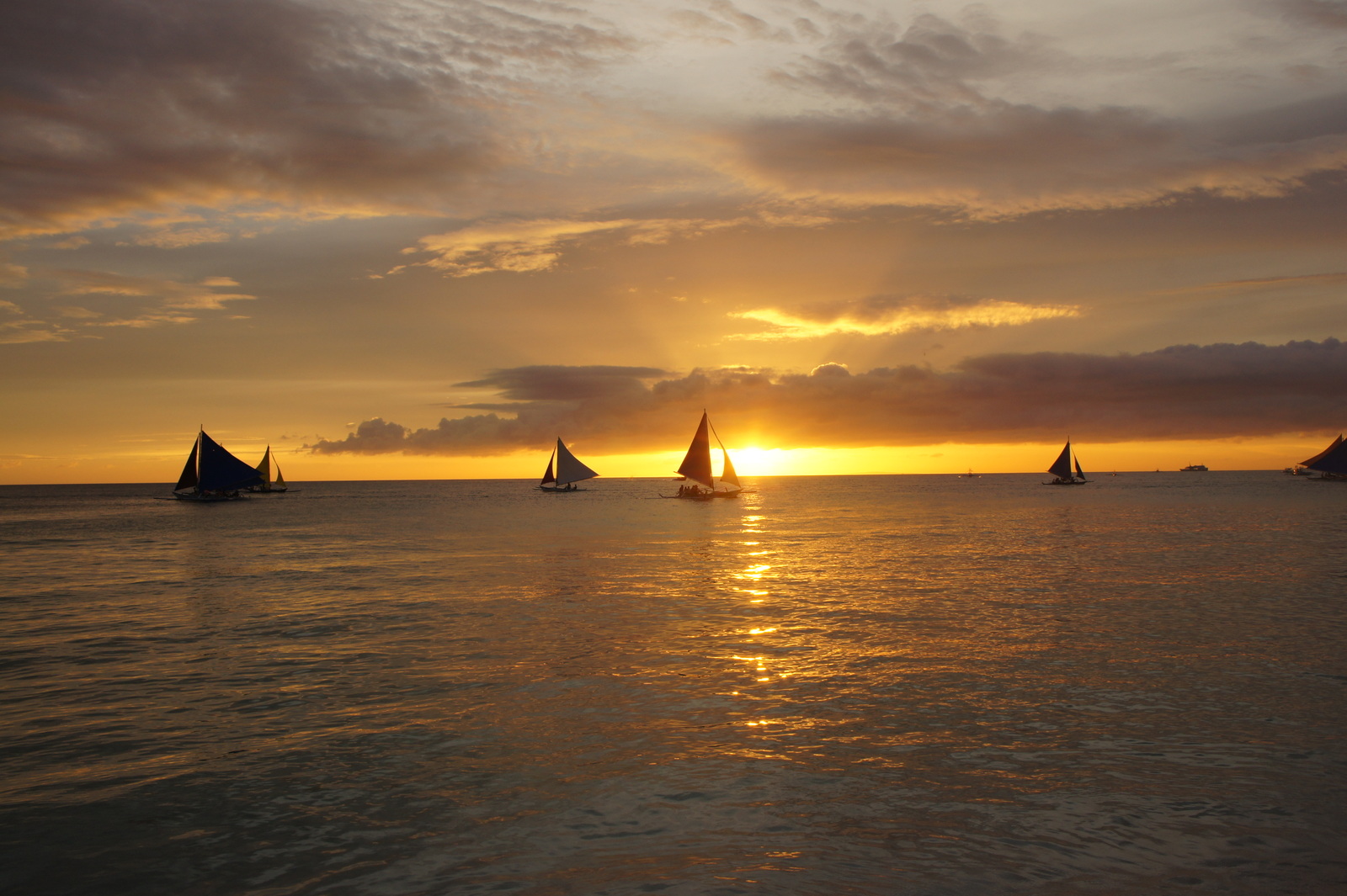 長灘島日落瑰麗的景色同樣令我震撼。在島上5天時間里,竟然天天都見到景色各異、變幻莫測的海上日落。每天傍晚,當夕陽向海平線墜落,天幕上厚重的云絮由白變灰、變暗,又慢慢被夕陽鍍上耀眼的金色,而此時還不是看日落最令人興奮的時候。當整個太陽倏然從海面跌落,淡出了我們的視線,我們正要為眼前景色的消失感嘆時,壯麗的晚霞會出其不意地大放異彩。